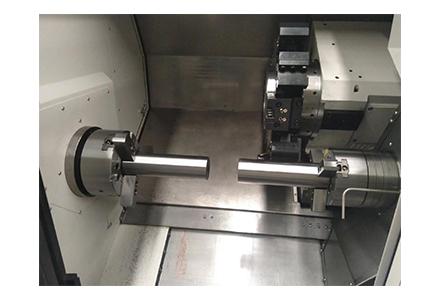 2)主軸箱及副主軸箱采用電主軸結(jié)構(gòu),主軸轉(zhuǎn)速高,剛性好,動(dòng)態(tài)響應(yīng)快,提高了加工圓度和表面的精度。對列式雙電主軸結(jié)構(gòu)可在高速旋轉(zhuǎn)的情況下進(jìn)行工件交換,配合12工位伺服刀架,可實(shí)現(xiàn)對工件的全部或大部分工序的加工,很大程度上節(jié)省了裝夾和加工時(shí)間,提高了加工效率。雙C軸功能可在任一主軸上進(jìn)行工件分度和曲面插補(bǔ)加工。